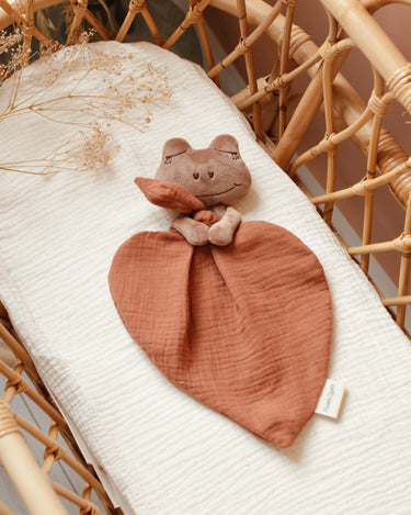 Avec son adorable minois et niché dans sa petite feuille, ce doudou grenouille personnalisé sera un véritable concentré de réconfort et de douceur pour votre bébé. Son minois est en minky tout doux, tandis que le corps, en forme de feuille, est fabriqué en double gaze , un tissu lange léger et délicat ou en minky également pour un maximum de douceur. Parfait pour que bébé puisse le mâchouiller en toute sécurité.
