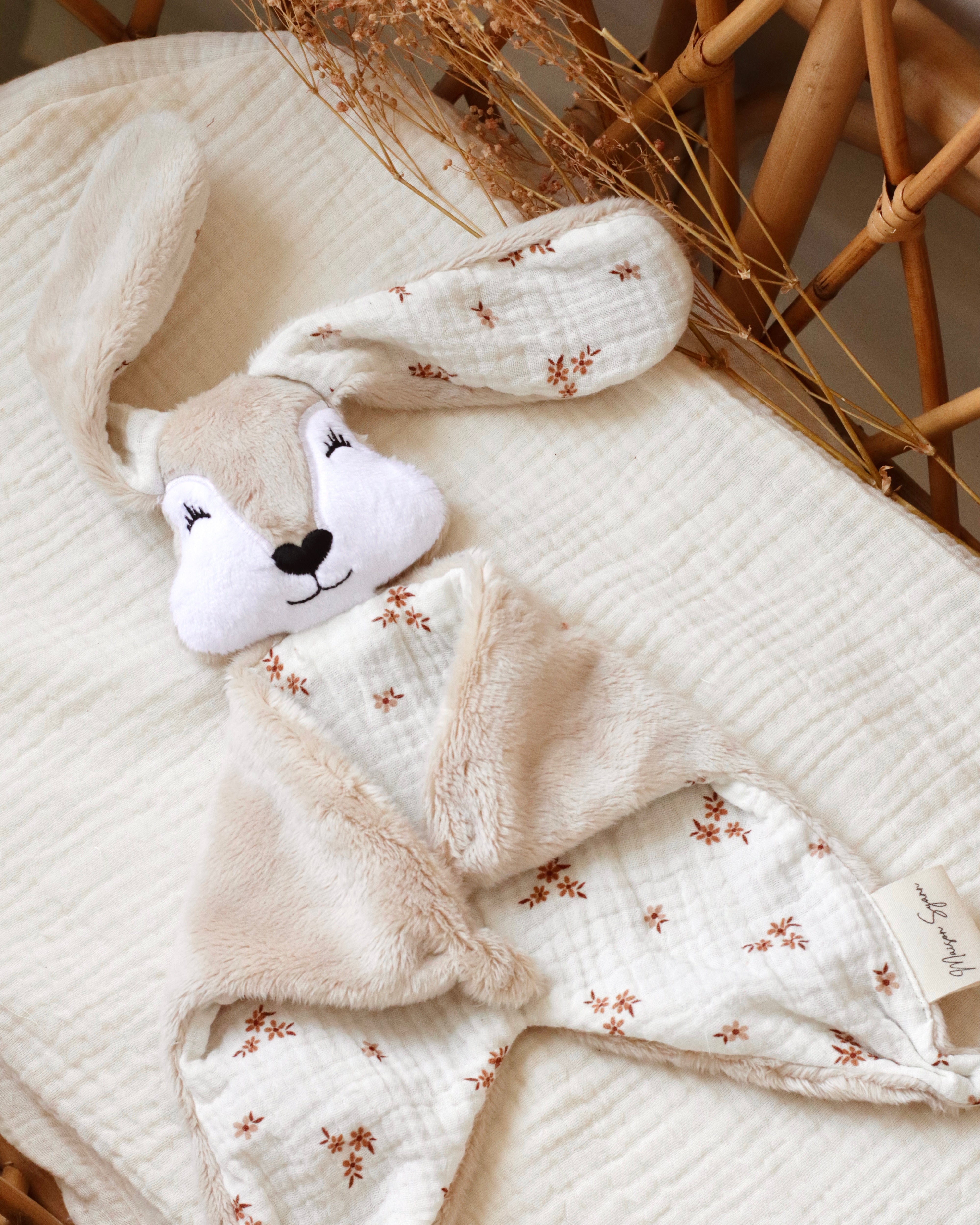 Je vous présente le doudou plat Gabin le lapin. Sa bouille n'est pas trop mignonne ? Vous pouvez le personnaliser au grés de vos envies pour qu'il devienne le compagnon idéal de bébé. Sélectionnez les tissus en fonction de l'univers dans lequel vous souhaitez l'accueillir.