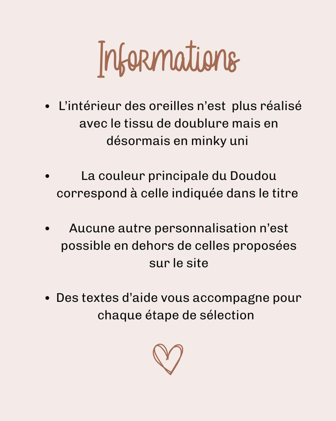 Vous pouvez personnaliser votre doudou en faisant broder le nom du futur propriétaire ou un petit mot. Vous pouvez également y ajouter l'option attache tétine pour que bébé n'égare pas sa tétine.