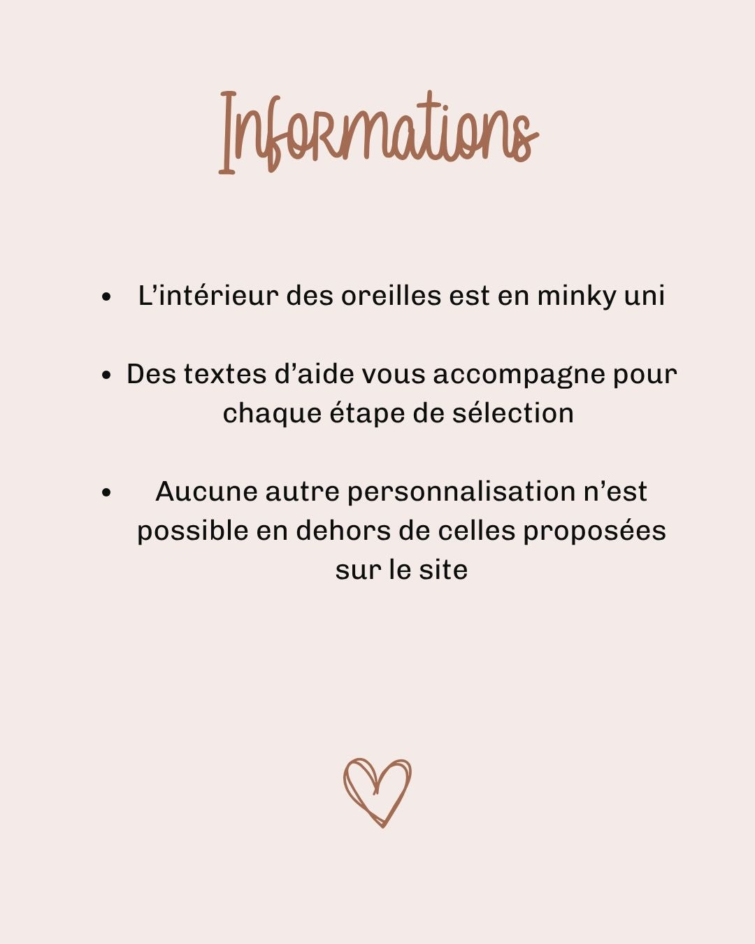 Vous pouvez personnaliser votre doudou en faisant broder le nom du futur propriétaire ou un petit mot. Vous pouvez également y ajouter l'option attache tétine pour que bébé n'égare pas sa tétine.