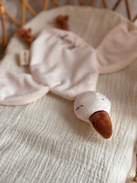 Je vous présente le doudou plat Bertille l'oie. Sa bouille n'est pas trop mignonne ? Vous pouvez le personnaliser au grés de vos envies pour qu'il devienne le compagnon idéal de bébé. Sélectionnez les tissus en fonction de l'univers dans lequel vous souhaitez l'accueillir.