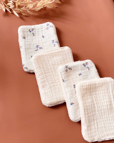 Le Lot contient 4 lingettes en double gaze de coton et éponge de bambou pour la toilette de bébé. Une lingette mesure 9 cm par 12 cm.